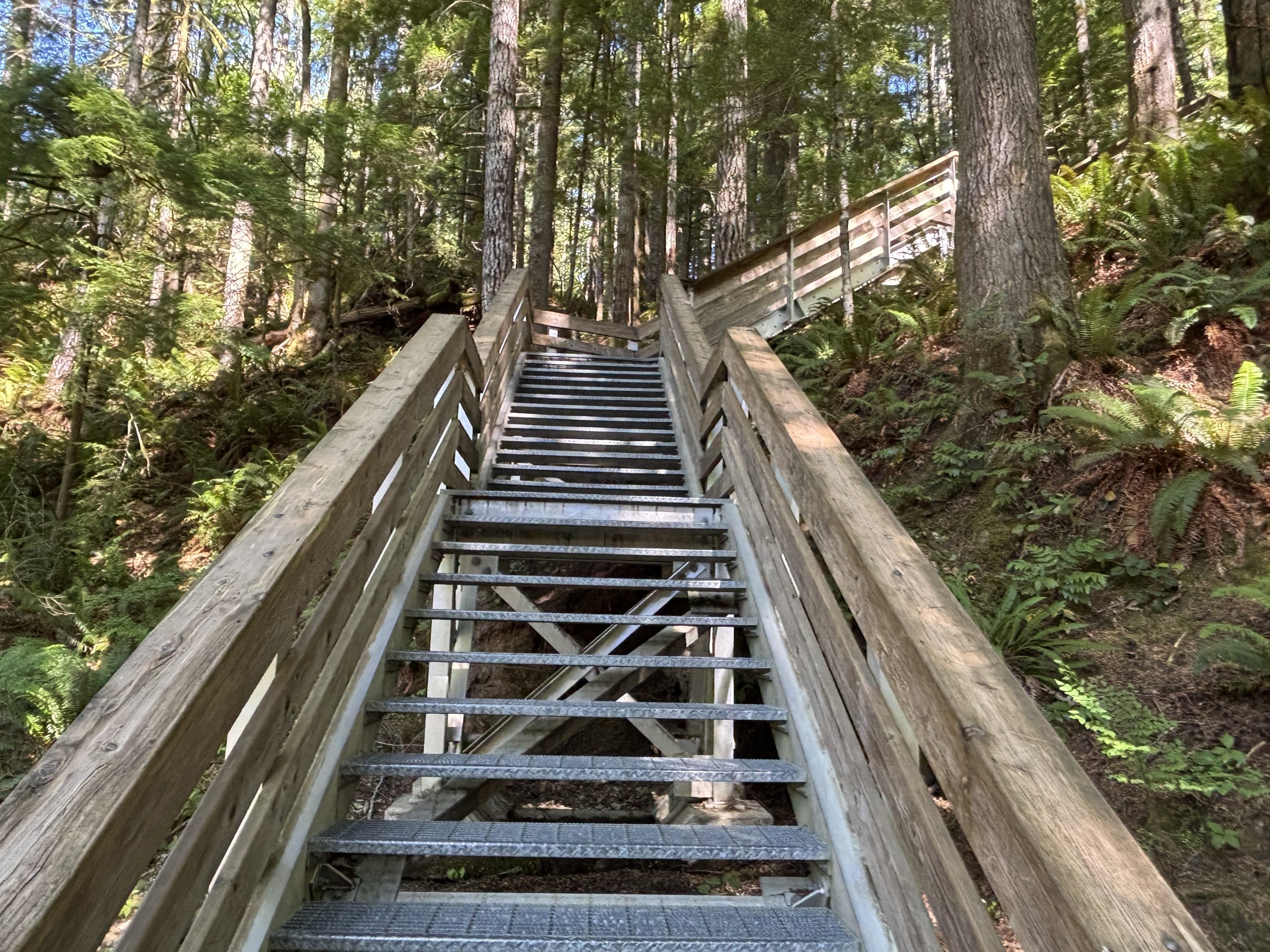 If you prefer an easier hike, you can drive 3 km up Gold River Highway to Elk Falls Park Road (on the right). Follow the signs to a large parking lot. From there, take the Millennium Trail. You’ll cross a bridge, enter the forest, and head downhill toward the falls. The trail is wide, flat, and easy to follow, with about 1 km of walking from the parking lot. Metal steps lead down to the viewing platform and suspension bridge.Elk Falls Provincial Park